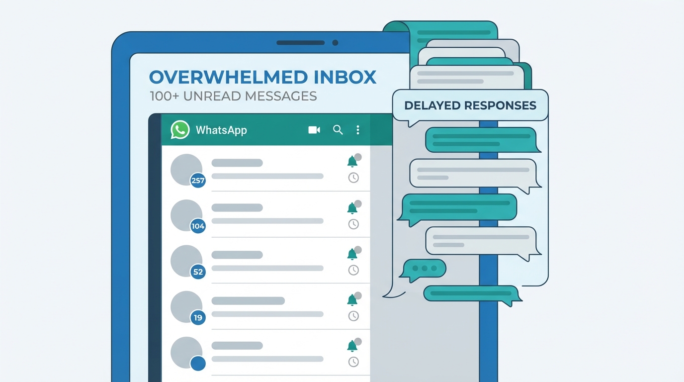 Overwhelmed WhatsApp inbox with delayed responses